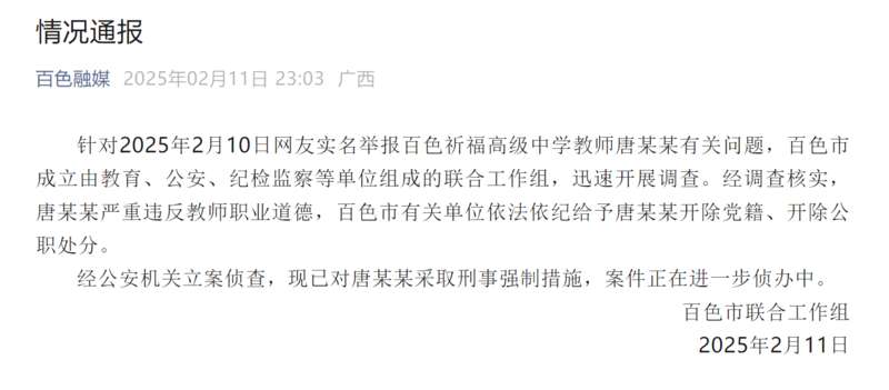 2月11日晚,广西百色市联合工作组发布通报称,经调查核实,唐某某严重违反教师职业道德,百色市有关单位依法依纪给予唐某某开除党籍、开除公职处分。经公安机关立案侦查,现已对唐某某采取刑事强制措施,案件正在进一步侦办中。