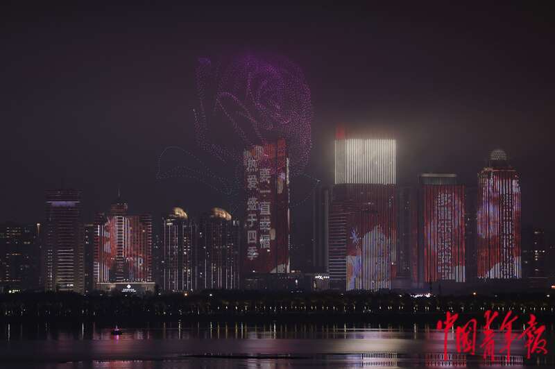 2月12日,海南海口,2025年海口元宵烟花晚会现场,3000架无人机在空中组成玫瑰花的图案。刘占崑/摄