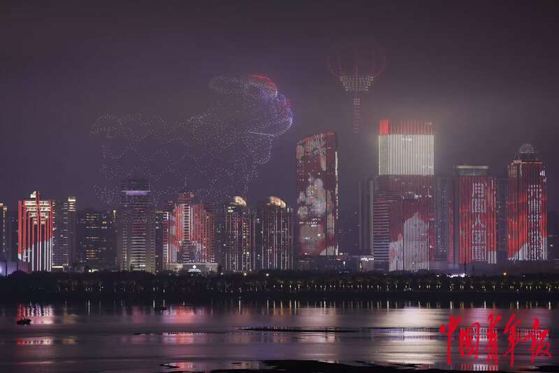 2月12日,海南海口,2025年海口元宵烟花晚会上的无人机表演呈现“舞狮”造型。本次表演由3000架无人机组成编队,采用先进的第三代箱内起飞编队无人机,具备长续航能力,灯光效果炫彩夺目。刘占崑/摄