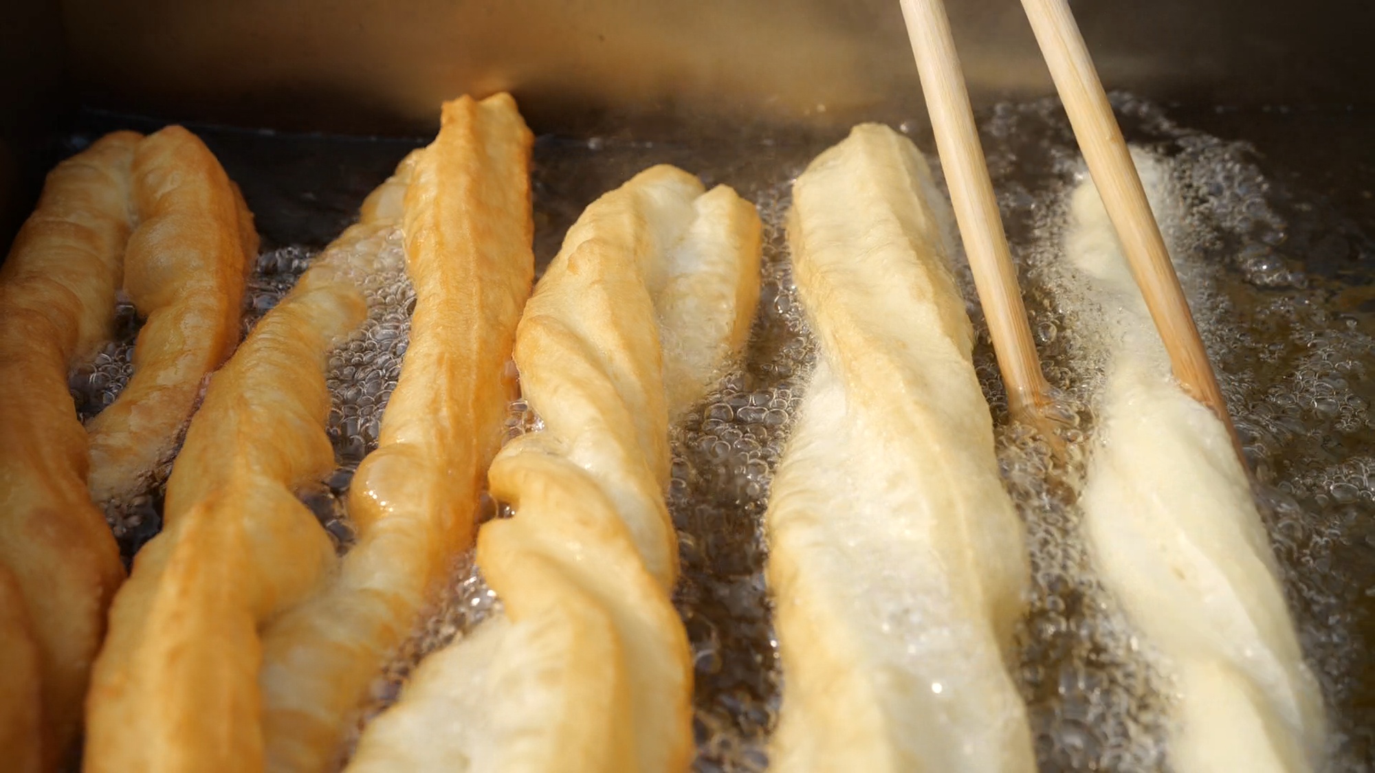 史梅菊卖早餐卖了二三十年,今年她和小叔子江新军代表江庄村参赛。为防止面团粘连,史梅菊用擀面杖在油锅里沾点油后,再把面团擀成长面饼状。用刀快速切条,两个面饼条叠在一起,史梅菊再用手摁压几下,给油条在锅里留足发酵空间,以此保持油条的蓬松感。江新军负责不停地翻转锅里的油条。