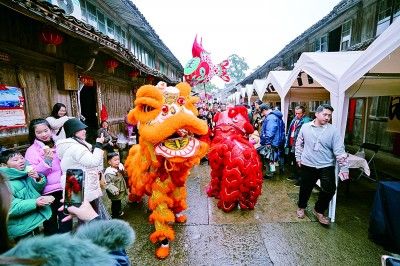 沙滩老街举办舞狮民俗表演,吸引游客打卡拍照。资料图片