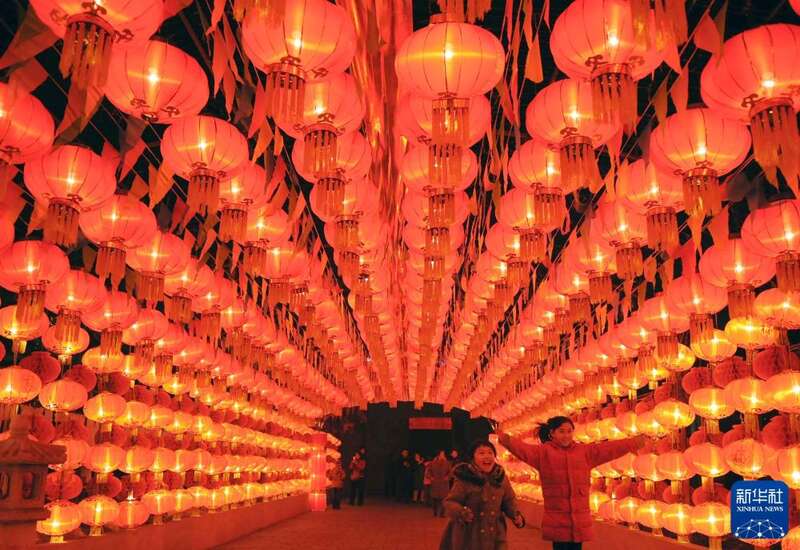 2008年2月20日,两名小朋友在呼和浩特市五塔寺花灯走廊里面玩耍。 新华社记者 任军川 摄
