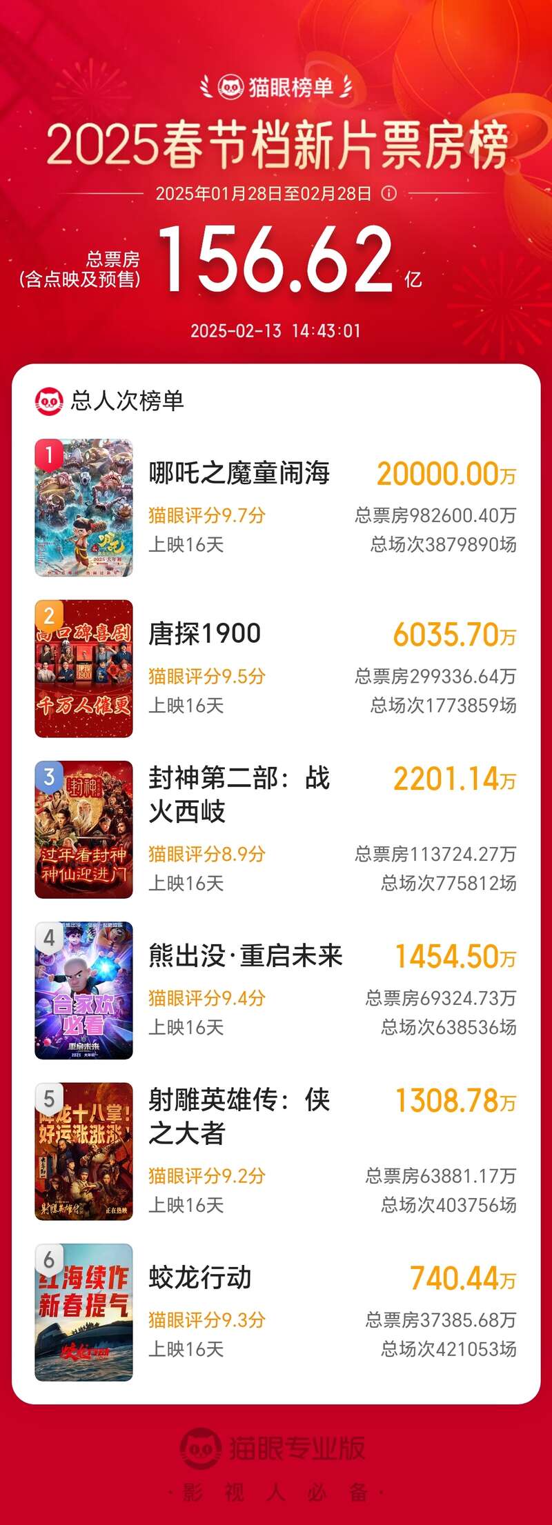 再创纪录!《哪吒2》成为中国影史首部观影人次破2亿电影