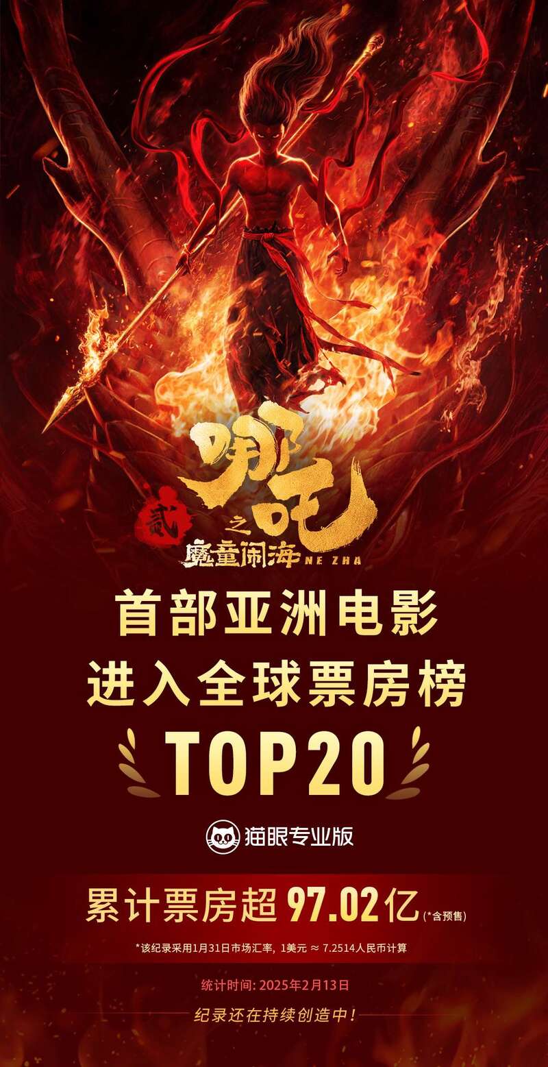 据猫眼专业版数据,《哪吒之魔童闹海》累计票房(含预售)超97.02亿,超《死侍与金刚狼》票房成绩,成为首部进入全球票房榜前20亚洲电影!
