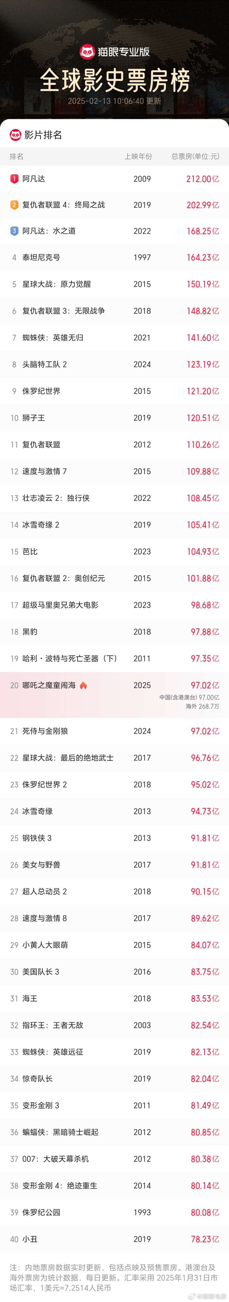 《哪吒2》成为首部进入全球票房榜前20的亚洲电影