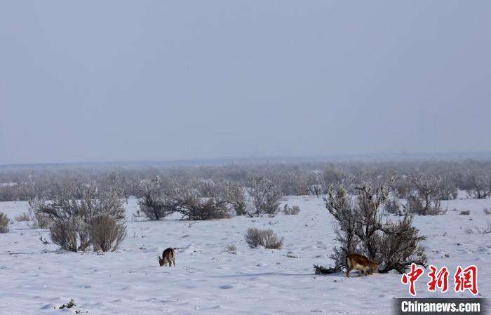 近日,护林员王伟踏着厚厚的积雪,与同事们行走在公益林腹地,为沙漠中的野生动物投放草料。
