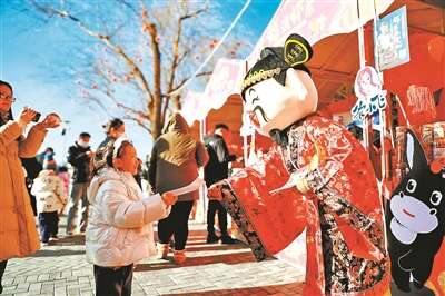 北京青年报记者在现场看到,舞龙等民俗表演与游客亲密互动,气氛欢快热烈。不少游客还参与猜灯谜、年画拓印、捞元宵等传统民俗活动。非遗皮影戏《武松打虎》等剧目演出展现原生态传统艺术,吸引游客驻足观看。
