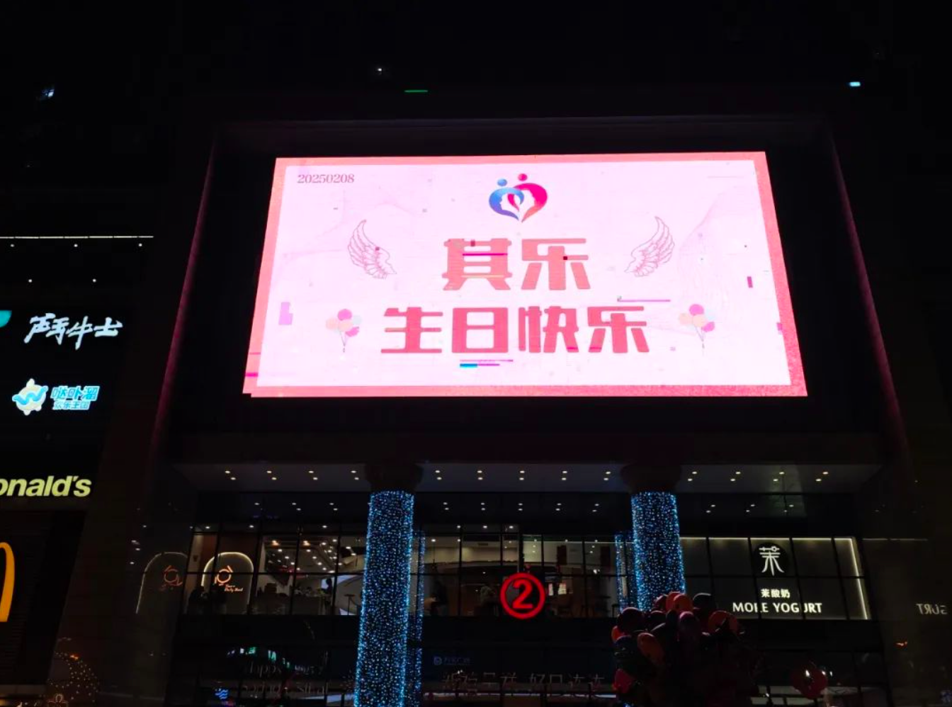 2月8日晚,在福建省龙岩市万宝广场LED屏幕上播放来自全国高校对卢其乐生日的祝福。