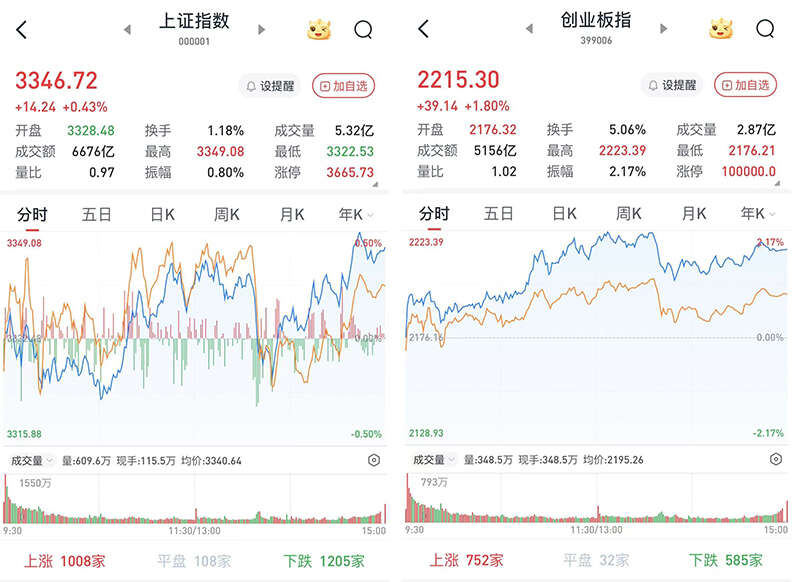 至收盘,上证综指涨0.43%,报3346.72点;科创50指数涨0.53%,报1022.46点;深证成指涨1.16%,报10749.46点;创业板指涨1.8%,报2215.3点。