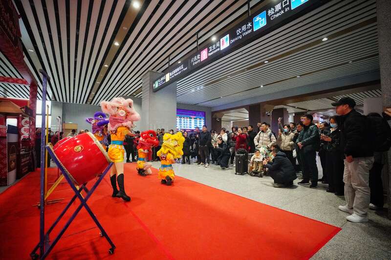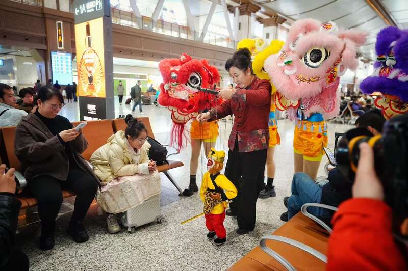 西安站里的提线木偶戏和舞狮与旅客互动。尤艇/摄