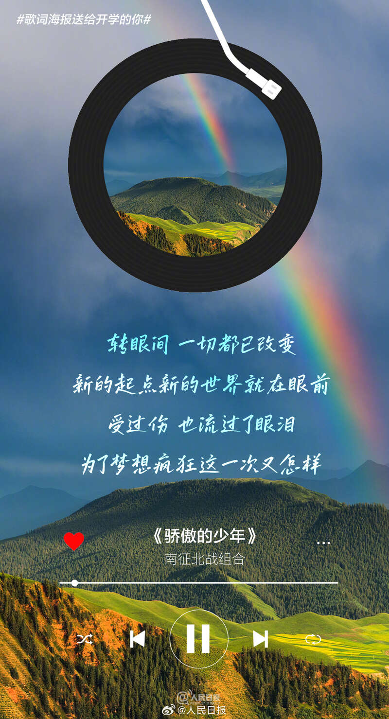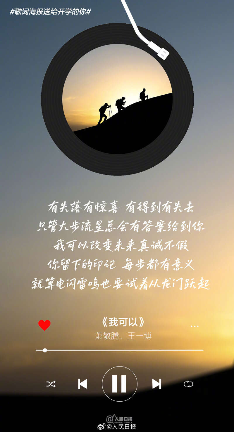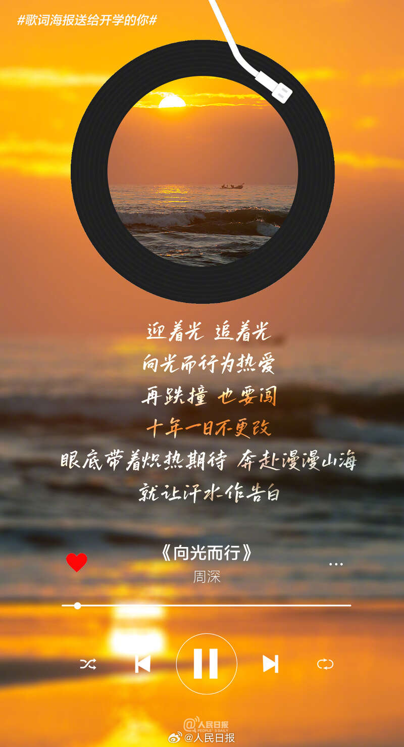 全国多地学校已陆续迎来春季学期,你开学了吗?“眼底带着炽热期待,奔赴漫漫山海”“少年自有少年狂,心似骄阳万丈光”“你留下的印记,每步都有意义”……一组歌词海报送给开学的你。新的学期,追梦前行,熠熠生辉!(来源:人民日报微博)