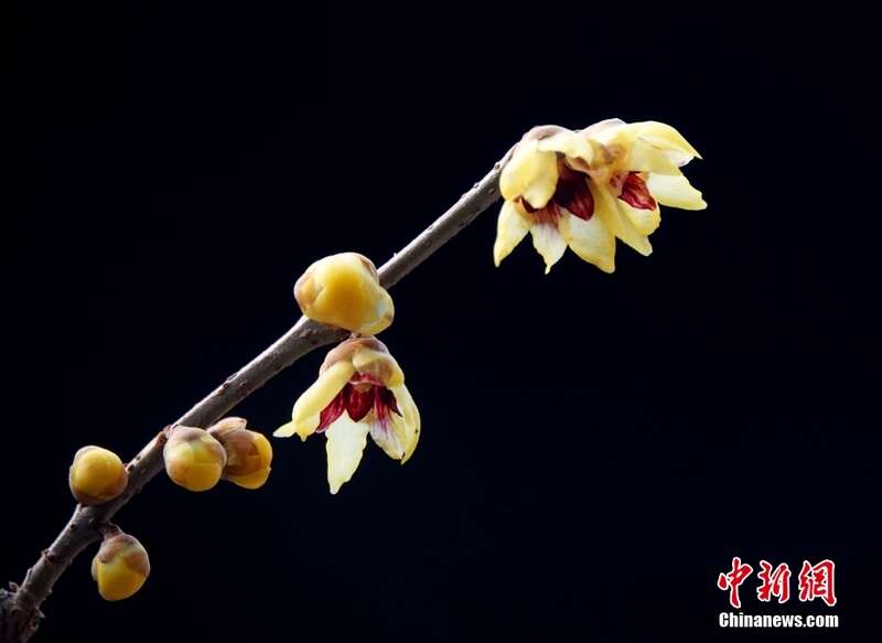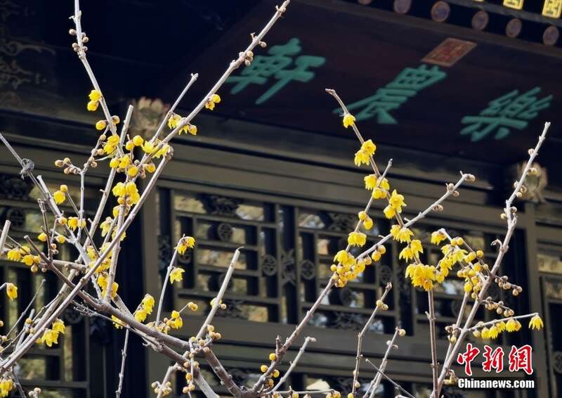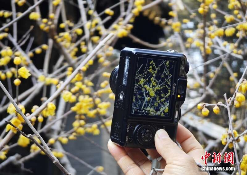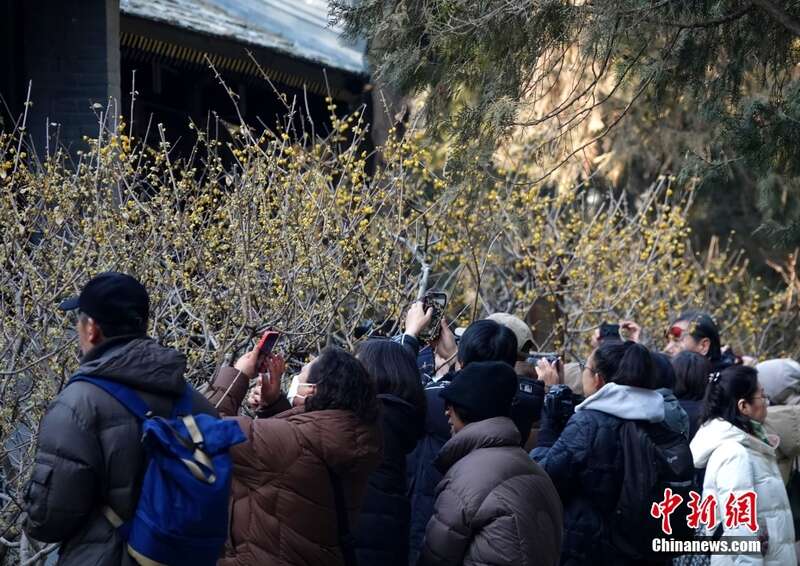 2月14日,北京春意融融,颐和园万寿山东麓乐农轩前的蜡梅陆续进入观赏期,朵朵黄花娇艳夺目,清香阵阵,吸引市民和游客前来观赏拍照。