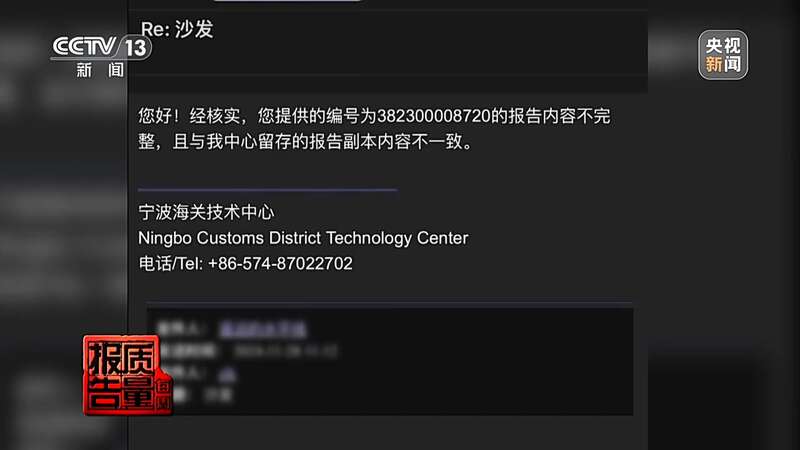 宁波海关办公室副主任 徐焱钵:技术中心是我们下属的一个单位,我们也了解了一下,他们说这个报告、这个编号检测报告不是我们这边出的。