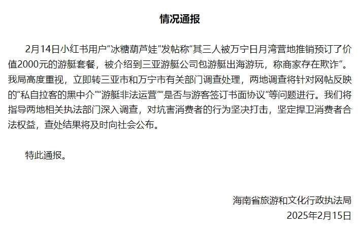 中新网2月16日电 据海南省旅游和文化广电体育厅官方公众号消息,海南省旅游和文化行政执法局15日发布通报,2月14日,有网友发帖称“其三人被万宁日月湾营地推销预订了价值2000元的游艇套餐,被介绍到三亚游艇公司包游艇出海游玩,称商家存在欺诈”。