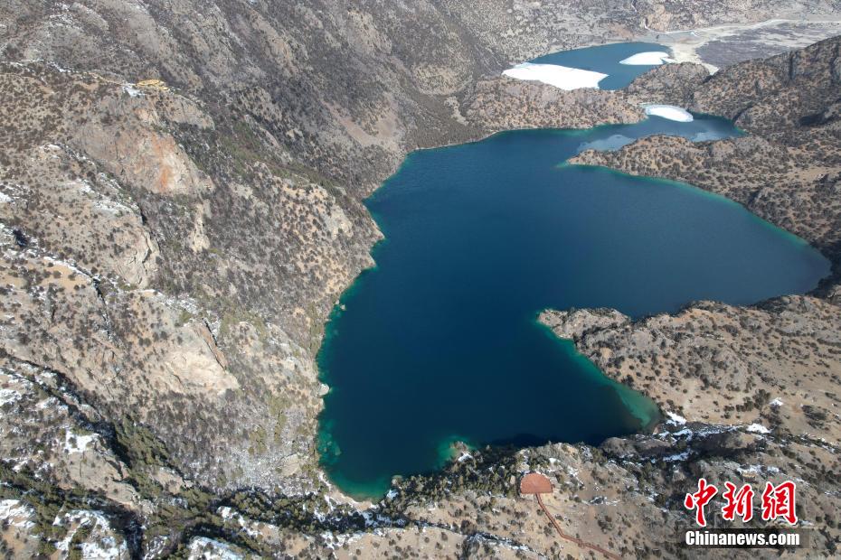 2月16日,位于西藏昌都市边坝县的“三色湖”在群山环抱中景色壮美。“三色湖”由黑湖、白湖、黄湖组成,群山环抱中的三处相邻湖泊在阳光下分别呈现不同色彩。图为三色湖景色。(无人机照片)