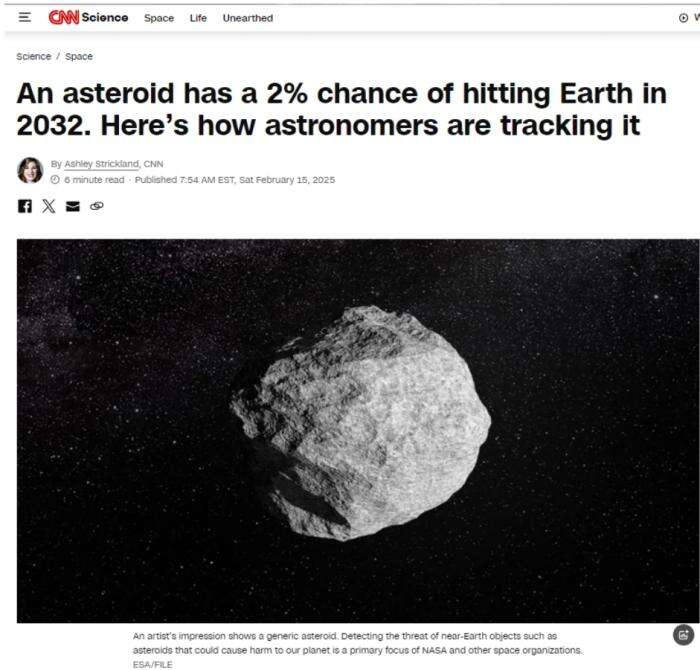 中新网2月16日电 据美国有线电视新闻网(CNN)报道,美国国家航空航天局(NASA)喷气推进实验室近地天体研究中心近日表示,一颗名为“2024 YR4”的小行星,有2%的概率将在2032年撞上地球。