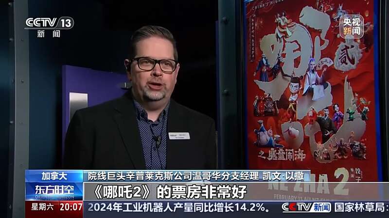 院线巨头辛普莱克斯公司温哥华分支经理 凯文•以撒:在这个放映厅,除了1个座位外,其他所有的座位都被买走了,我们的许多场次都已经卖完了,剩下的座位不多,《哪吒2》的票房非常好。