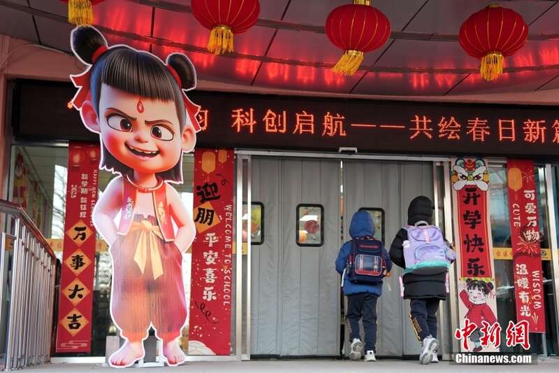 2月17日,北京市丰台区怡海小学,哪吒立牌欢迎学生返校。当日,北京中小学春季学期开学。