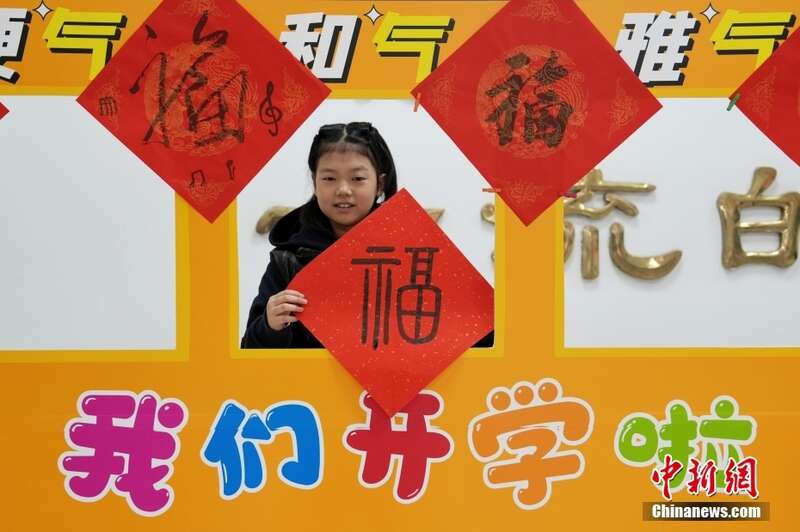 2月17日,北京市丰台区怡海小学,学生展示其书写的福字。当日,北京中小学春季学期开学。