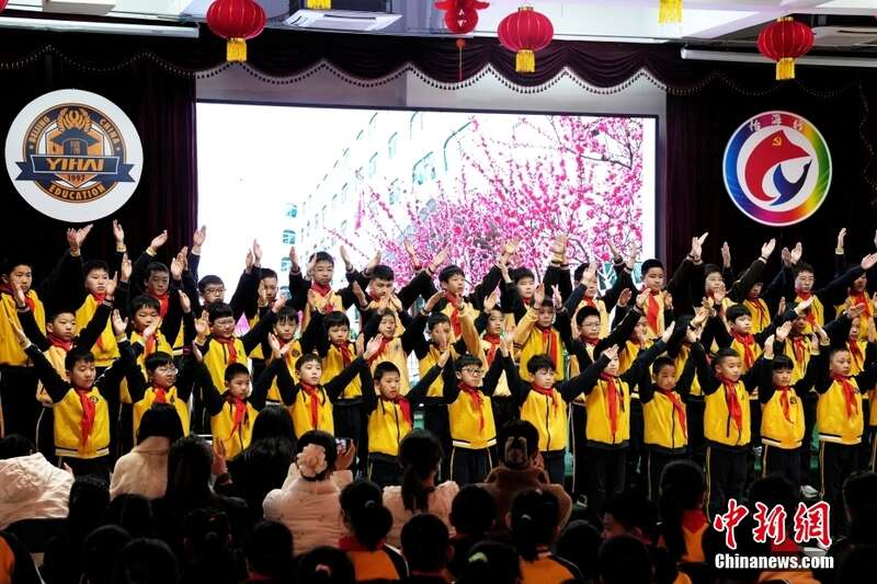 2月17日,北京市丰台区怡海小学,开学典礼上的合唱表演。当日,北京中小学春季学期开学。