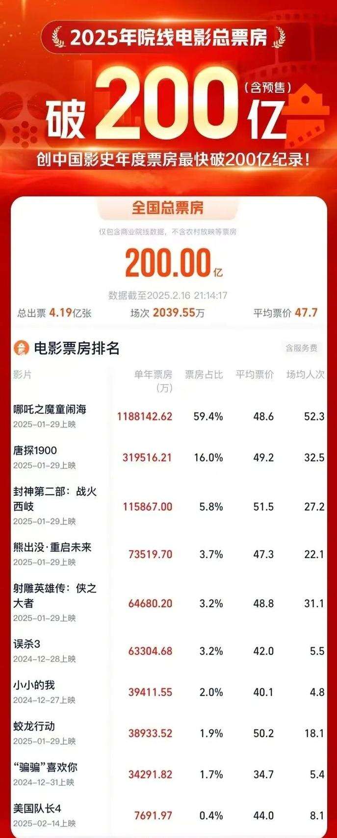 据网络平台数据,截至16日21时14分2025年度大盘票房(含预售)突破200亿刷新中国影史年度票房最快破200亿纪录!你今年看了几部电影?
