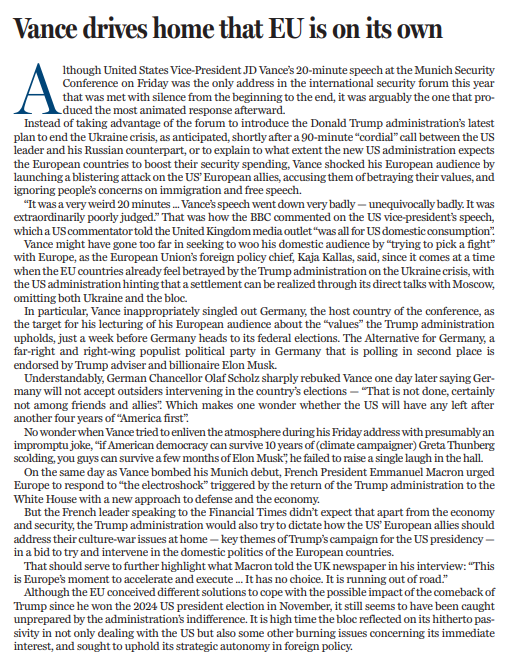 就在万斯的慕尼黑之行“翻车”之际,法国总统马克龙在接受《金融时报》采访时呼吁欧洲加快行动,以新的国防和经济政策应对特朗普政府回归白宫所带来的“电击式冲击”。但马克龙可能没想到,特朗普政府不仅在经济和安全问题上向欧洲施压,还试图对欧洲国家如何处理国内文化战争问题指手画脚。万斯的演讲表明,美国政府甚至有意介入欧洲国家的内政。正如马克龙所言:“欧洲已经别无选择,欧洲已经快无路可走了。”