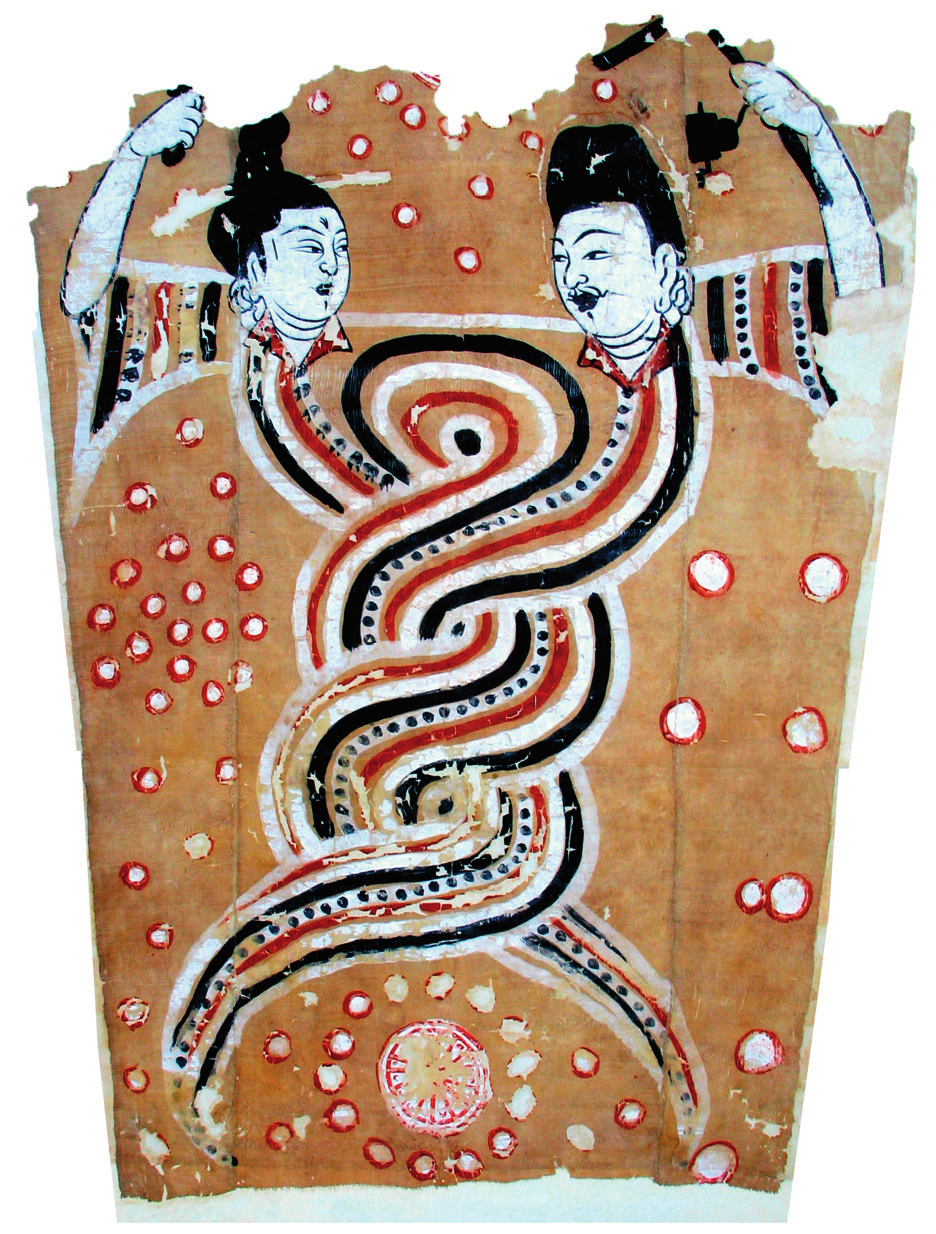 吐鲁番博物馆展厅内,两幅并排悬置的伏羲女娲像引人注目:其中一幅,伏羲女娲为深目高鼻、络腮卷须的胡人形象,另一幅则是中原汉族长相。