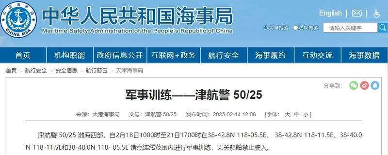 据中国海事局网站消息,大港海事局发布航行警告,2月18日10时至21日17时,渤海西部部分海域进行军事训练,无关船舶禁止驶入。