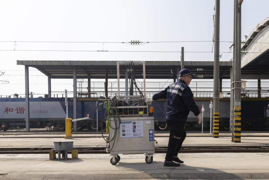 “这金属箱叫牵车机,相当于火车头的‘充电转接头’。”资深牵车员张永强拍了拍火车头门侧的装置。只见他拧动钥匙、设定参数,接地杆轻触点触插座的瞬间,“嘶”地迸出几簇火花,火车头随即缓缓启动。