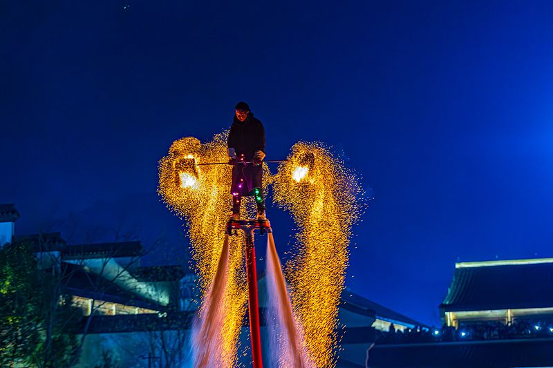 2025年2月16日,杭州余杭闲林埠老街华灯初上,非遗火壶、火棍率先登场,喷焰吐火,光彩夺目。旋即,水上飞人踏浪飞驰,于烟火间穿梭,水火交融,演绎惊险视觉盛宴。此番表演,吸引大批市民游客前来观看,千年古街在夜幕下迸发澎湃活力,现场欢呼声持续沸腾。