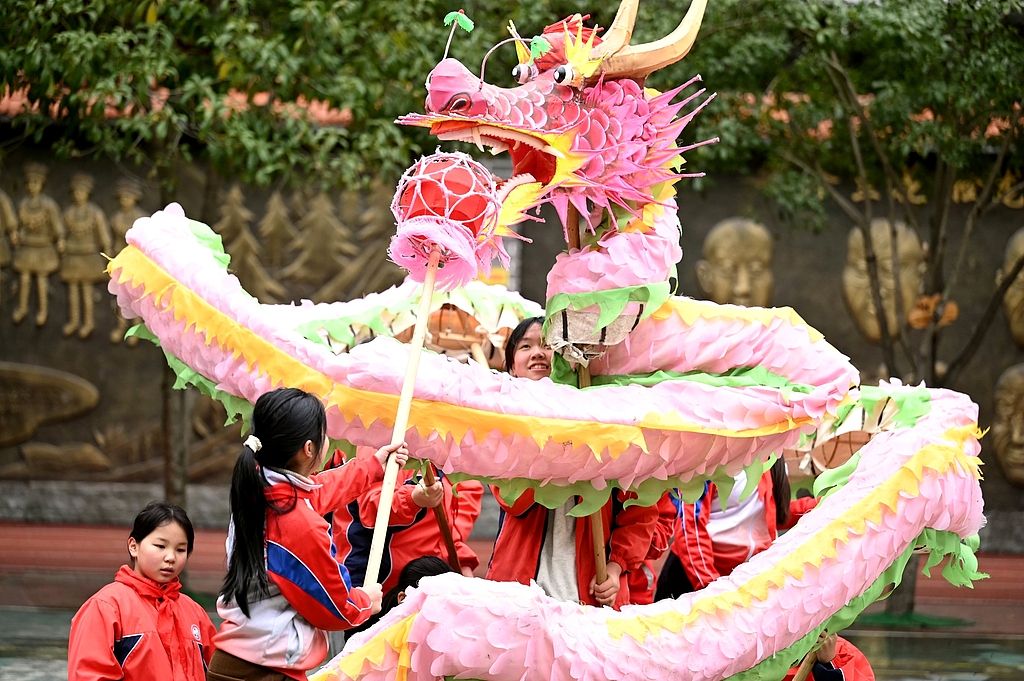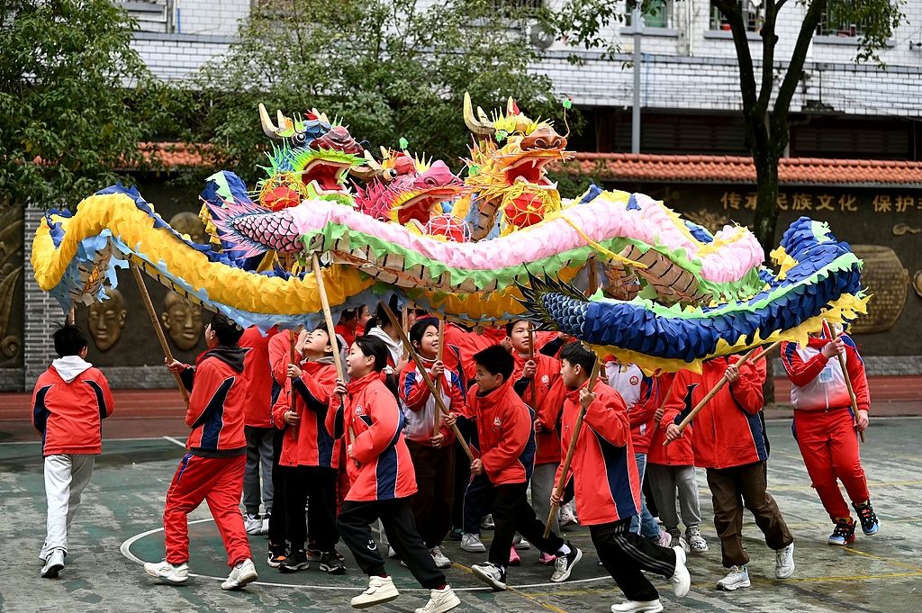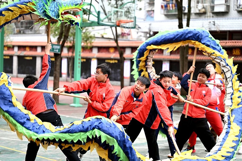 2025年2月18日,在贵州省黔东南苗族侗族自治州锦屏县城关二小,学生们在校园内练习舞龙。