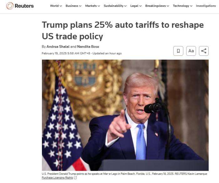 路透社报道称,特朗普长期以来一直强调,美国汽车在国外市场受到不公平待遇,比如,欧盟对汽车进口征收10%关税,是美国乘用车关税的四倍。不过,路透社也提到,美国对高利润的进口皮卡征收25%的关税。
