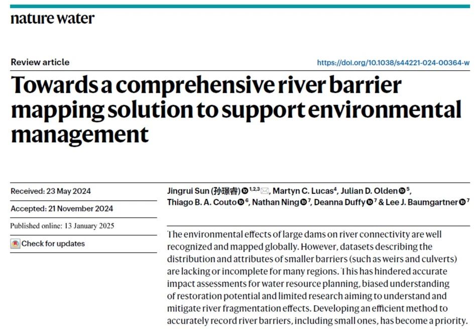 近日,国际河流与生态安全研究院孙璟睿副教授在Nature Water发表题为Towards a comprehensive river barrier mapping solution to support environmental management的学术论文(https://rdcu.be/d55lY ),探讨了河流障碍物检测的发展历程并提出了一套河流障碍物综合检测框架。