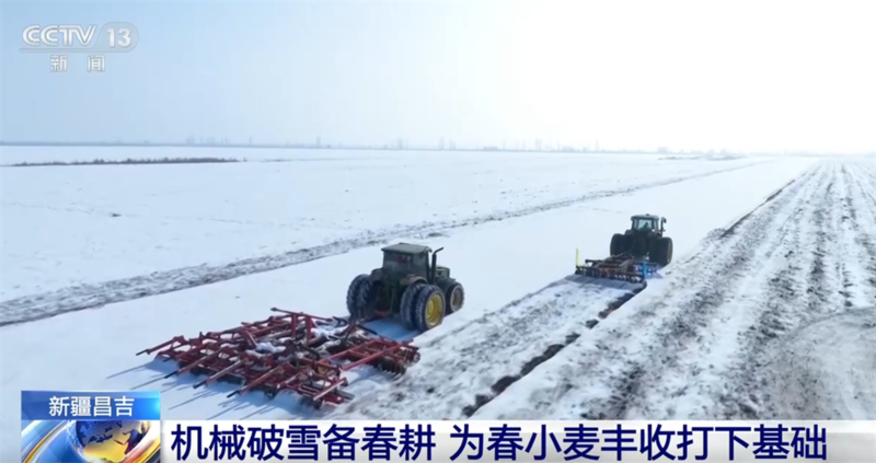 一年之计在于春。目前,在新疆北部,许多农田还被厚厚的积雪覆盖,但春耕备耕已经展开。昌吉回族自治州玛纳斯县正组织大型机械帮助农户进行破雪作业,确保春小麦播种顺利进行。