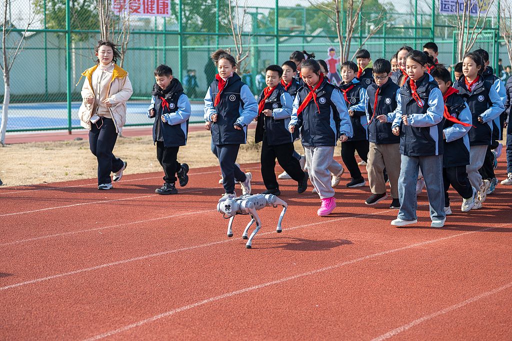 2025年2月19日,苏州,昆山市信义小学,机器狗带领学生在大课间活动跑步。