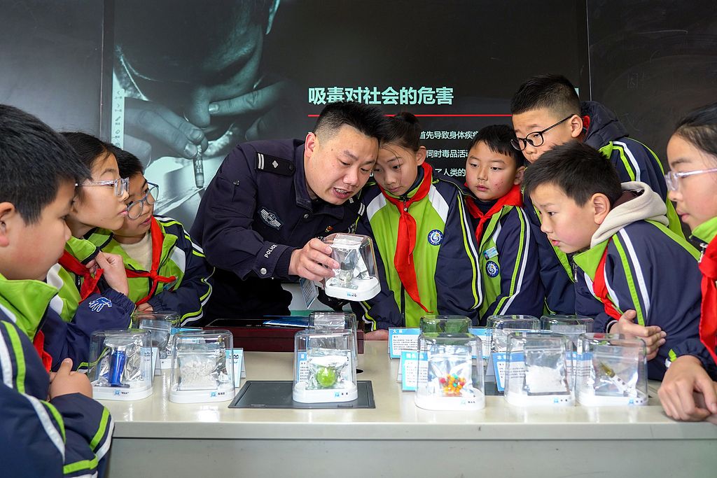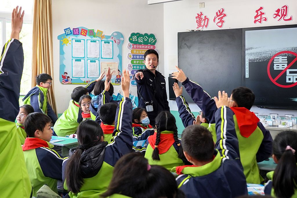 2025年2月19日,浙江省舟山市岱山县公安局禁毒大队民警在辖区高亭小学向学生讲解禁毒知识。