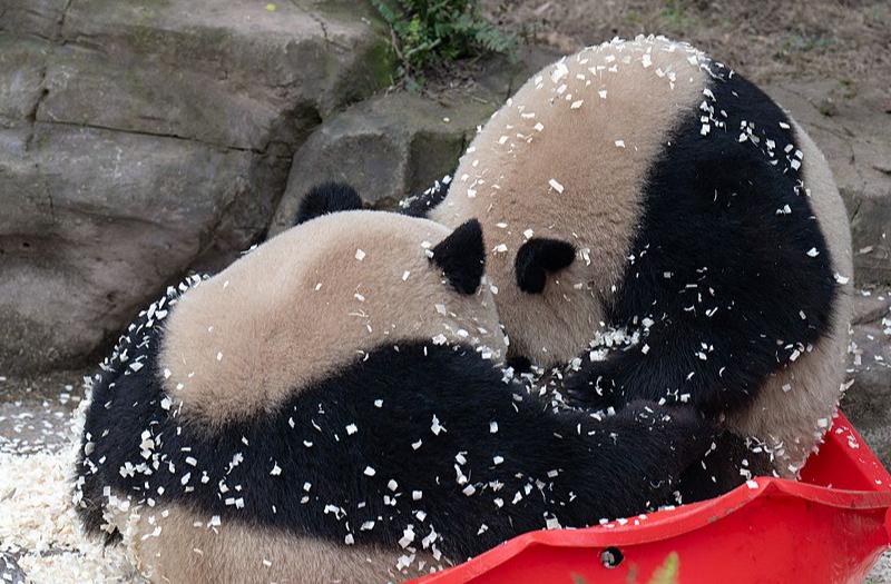 重庆:大熊猫玩木屑变身“桂花芝麻汤圆”