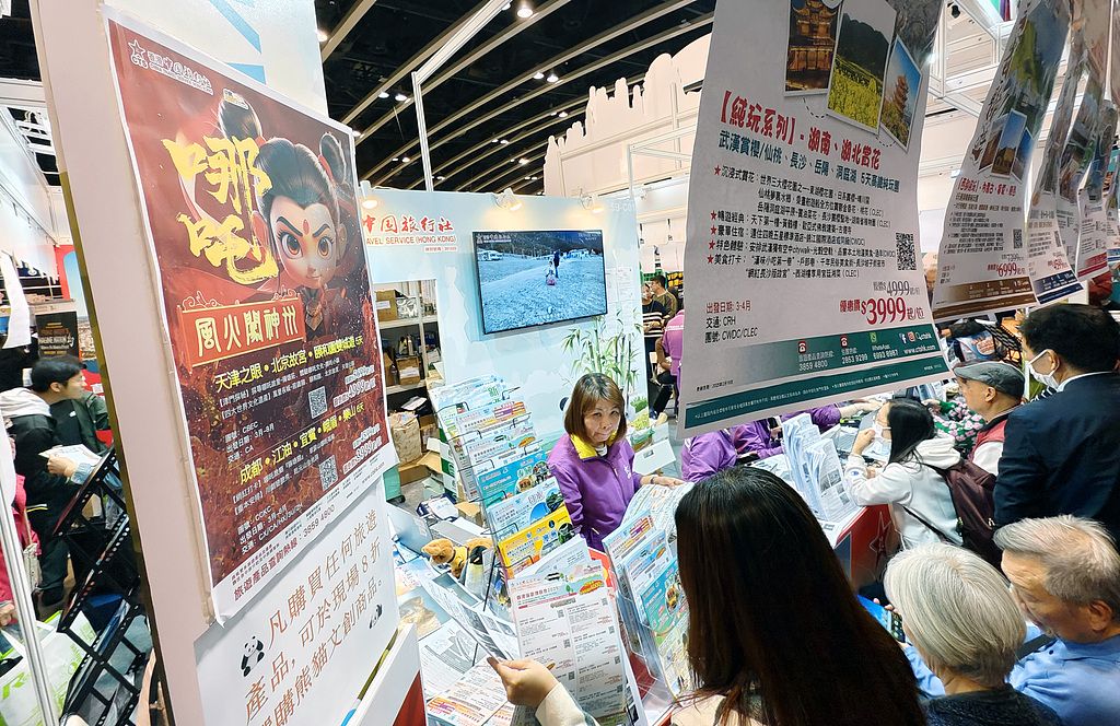 2025年2月20日,“香港旅游博览会2025”在香港会展中心开幕,超过100家知名旅游企业等布展300余个展位,力促旅游经济发展。图为一家参展旅游企业响应近期热映的动画电影《哪吒2》,推出哪吒相关主题的内地旅游项目。 中新社记者 侯宇 摄
