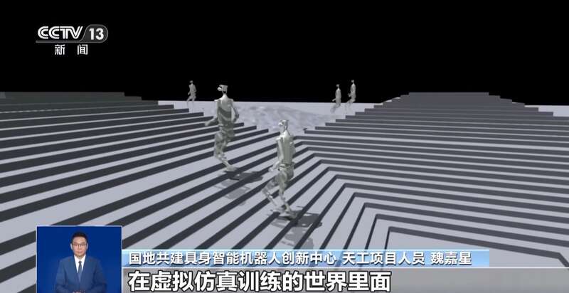 国地共建具身智能机器人创新中心天工项目人员 魏嘉星:对于人形机器人来说,要做到稳定的感知行走,其实对于它的整个计算能力是有非常高的要求的,要保持50毫秒以内的高频率视觉更新。同时我们会把视觉感知的一些信息和本体信息,在虚拟仿真训练的世界里进行部署。部署好了之后,会有成百上千台机器人结合这种算法进行优化和迭代。我们把效果训练好之后,再部署到真实物理世界的机器人身上,就可以让它具备一个很好的感知行走能力了。