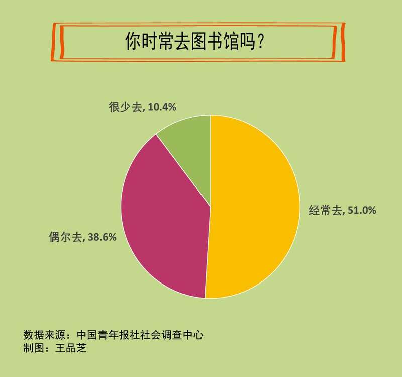 调查中,51.0%的受访者经常去图书馆,38.6%的受访者偶尔去,10.4%的受访者很少去。