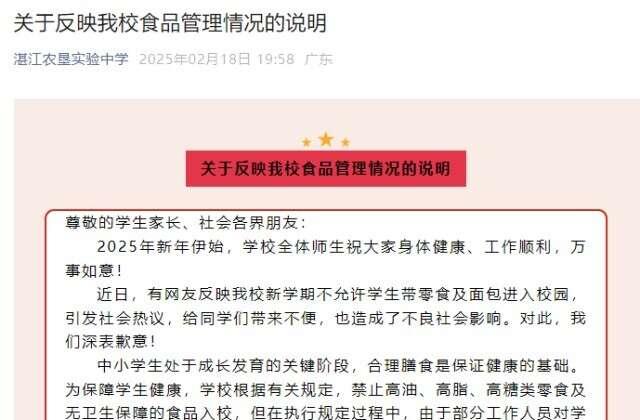 湛江一高中就不许学生带面包入校致歉:工作人员理解规定不透彻