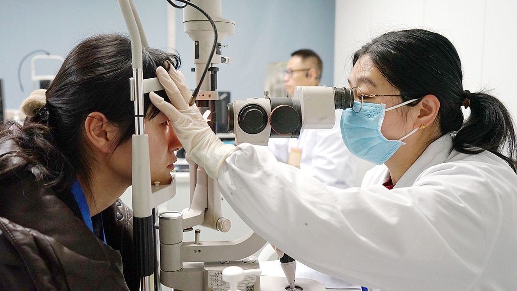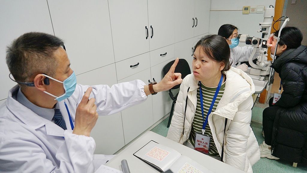 2025年2月21日,浙江嘉兴,海警医院医务人员为适龄应征女青年检查鼻腔。