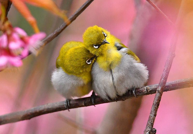 2025年2月19日,贵阳市水东路南明河畔,冬樱花陆续绽放,一对乖巧的绣眼鸟在树枝上嬉戏。