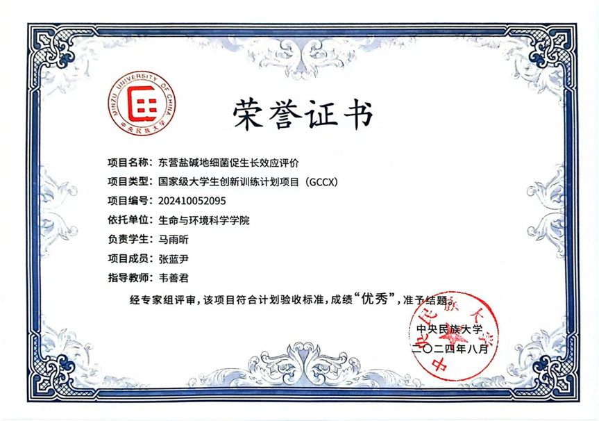马雨昕曾参与中央民族大学本科生研究训练计划项目“城市典型场景积尘中微塑料分布特征分析”,主持国家级大学生创新训练计划项目“东营盐碱地细菌促生长效应评价”,开展“应用STTM技术分析miR858对于蒙古黄芪苯丙烷途径的影响”项目等,曾在国际刊物上发表学术论文一篇。