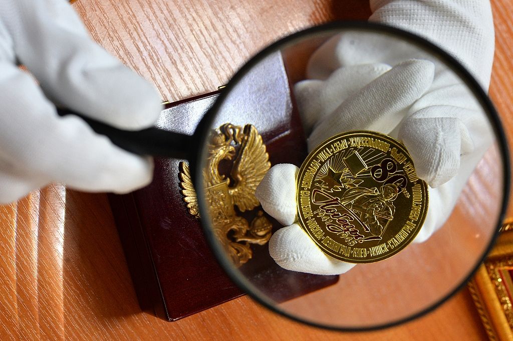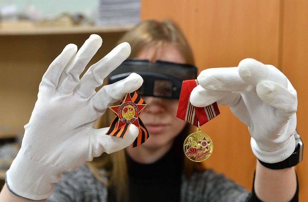 当地时间2025年2月21日,俄罗斯车里雅宾斯克,一名员工在Breget艺术工厂检查奖章。该工厂启动了以庆祝世界反法西斯战争胜利80周年为主题的周年纪念产品生产。