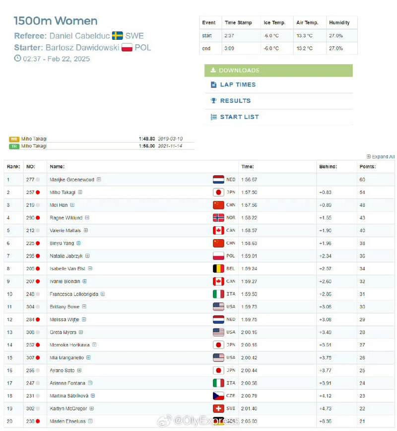 在女子1500米比赛中,荷兰选手格罗恩伍德以1分56秒67夺冠,日本名将高木美帆和中国选手韩梅分获亚军和季军,杨滨瑜排名第六。
