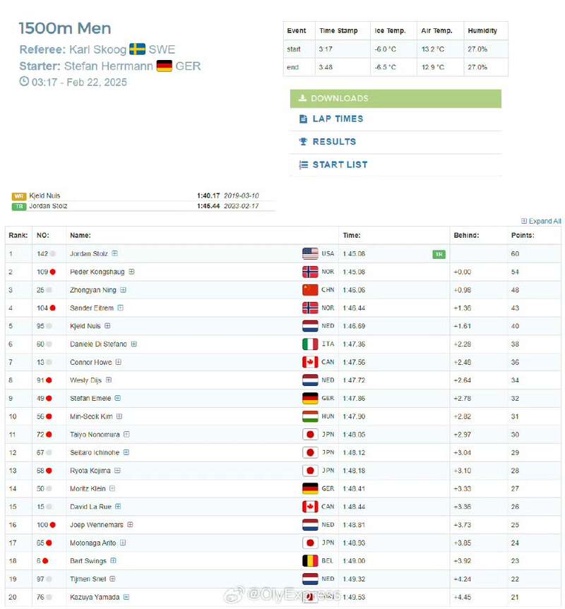 在男子1500米比赛中,美国选手斯托尔兹以1分45秒08夺冠,宁忠岩获得铜牌。