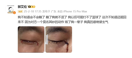 周二,郭艾伦在社交媒体上表示,自己是在训练中被对方手指戳中了眼睛,导致结膜破碎,缝了40多针。