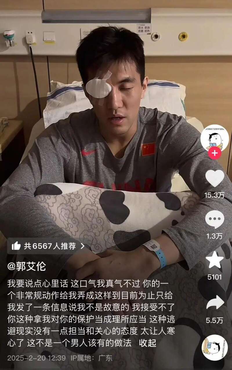 根据俱乐部的通报,周一,球队的队内对抗训练中发生意外,郭艾伦右眼不幸受伤。目前他已完成手术,进入恢复阶段。