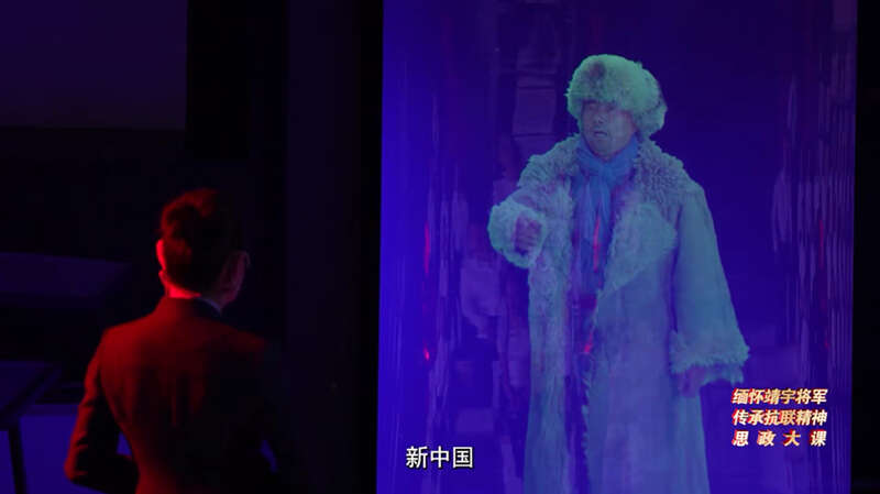 课程最后,王莹与AI成像的杨靖宇开展了一段“穿越时空的对话”。“将军,我们现在国强民富,都能够有尊严地活着,再也没有人敢欺负我们了!”“是真的吗?这要是真的,我们那么多,那么多战士的流血牺牲都值了!真想看看新中国!新时代!”“将军,是真的,这盛世已如您所愿!这就是我们的新中国!新时代!”